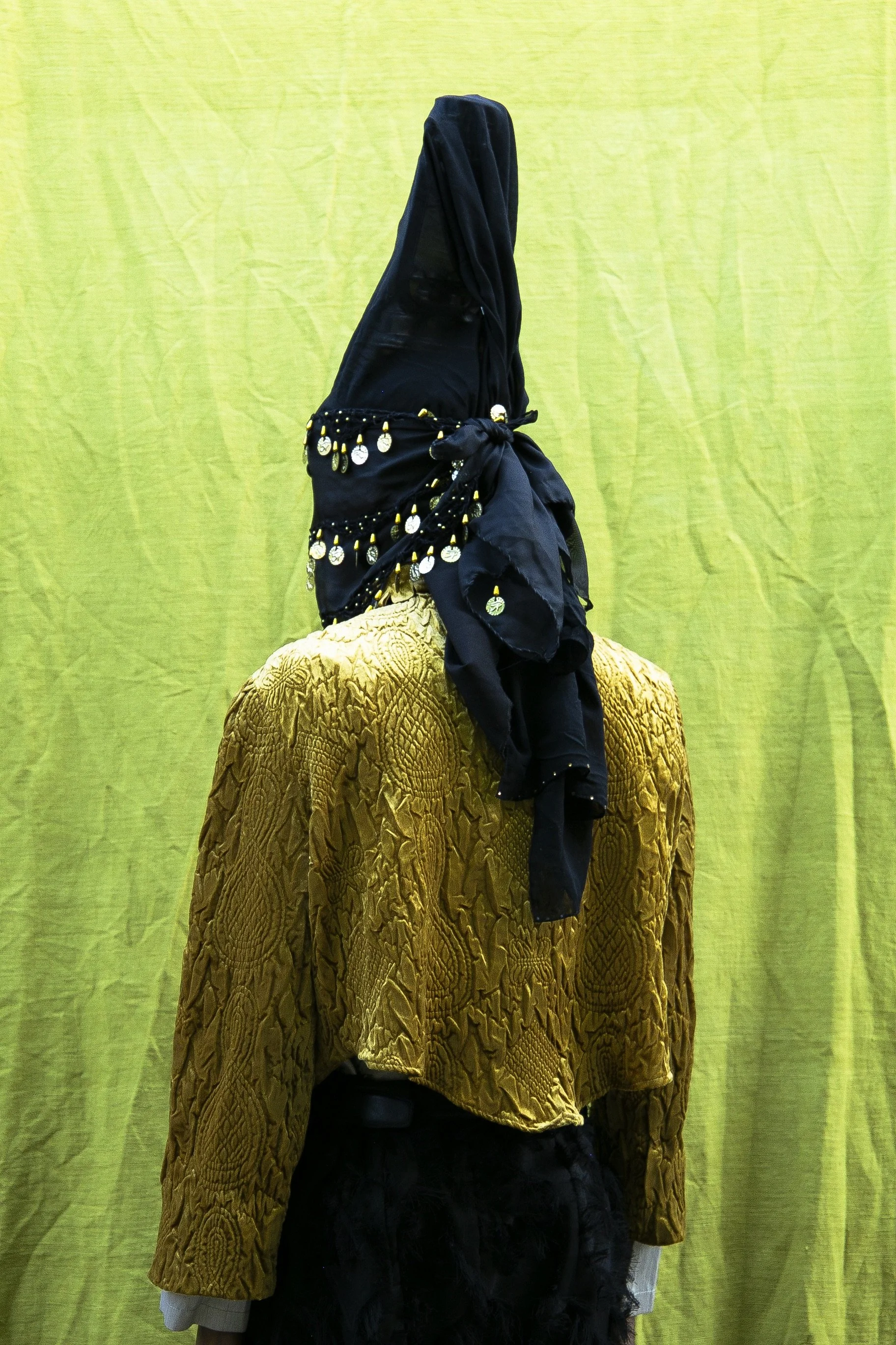 The second body of work, My Beauty Is The Beauty of The Other(ed) Places (2022–2023), looks at ceremonial mask making, modern shrouding applications, and anti-recognition garments as technologies of resistance. These works examine invisibility, hyper-visibility, and disappearance — using garments, masking, and shapeshifting forms as a revolt against surveillance and hegemonic othering. Drawing on folklore, counter-histories, and Saidiya Hartman’s concept of “critical fabulation,” Ahmed imagines alternate timelines where archives are re-stitched and forgotten bodies, stories, and histories are brought back into collective memory.