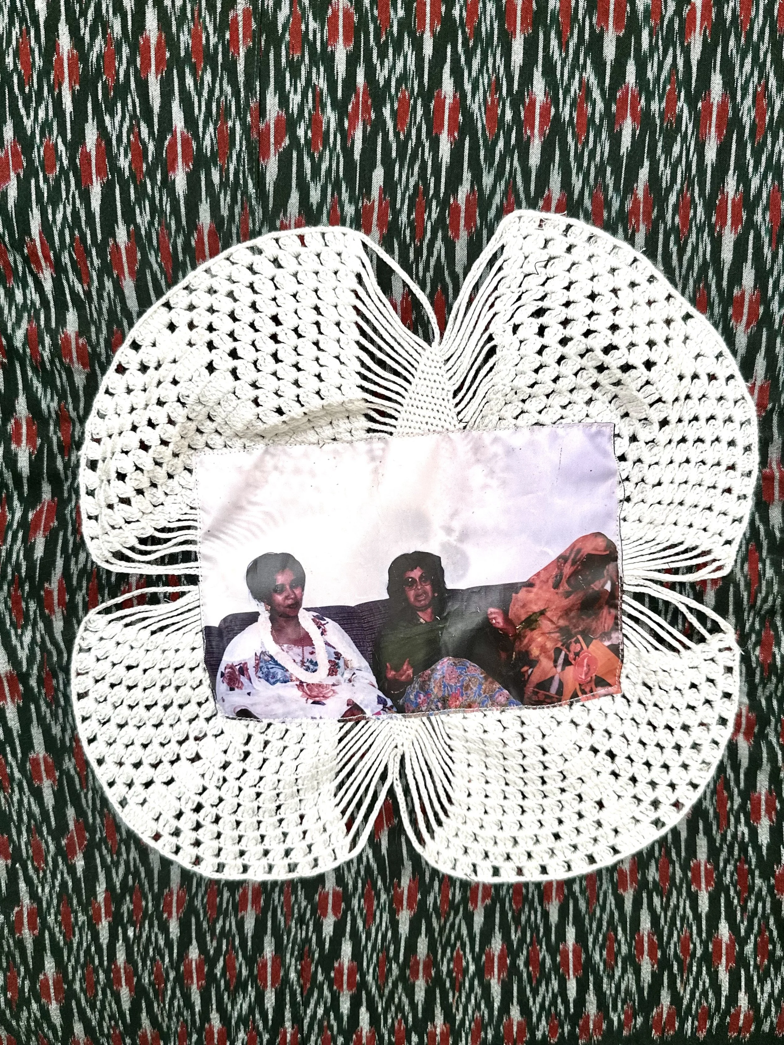 My textile sculptures chart familial cartographies, cosmologies of belonging, of rupture & loss. I create tessellating poem maps navigating the uncharted terrain of my family tree through the modes of familial ethnographic interventions, through the collection/ digitization/use of archival photos, letters, cassette tapes, through refurbishing material heritage (textiles & jewelry) in order to make sense of the past & reimagine alternative futures. Drawing on the mnemonic and memorial potentials of textiles, my work explores cultural heritage, code-making and inherited stories. It is concerned with the themes of re-memory, edited memory and experimental bio-mythologies.